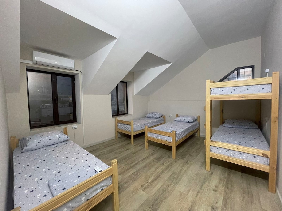 سرير في نُزُل في كيشيناو. يوجد 5 أسرّة مفردة في الغرفة. حمامان ومطبخ وثلاجة وميكروويف وموقد كهربائي. جميع الغرف مكيفة الهواء.