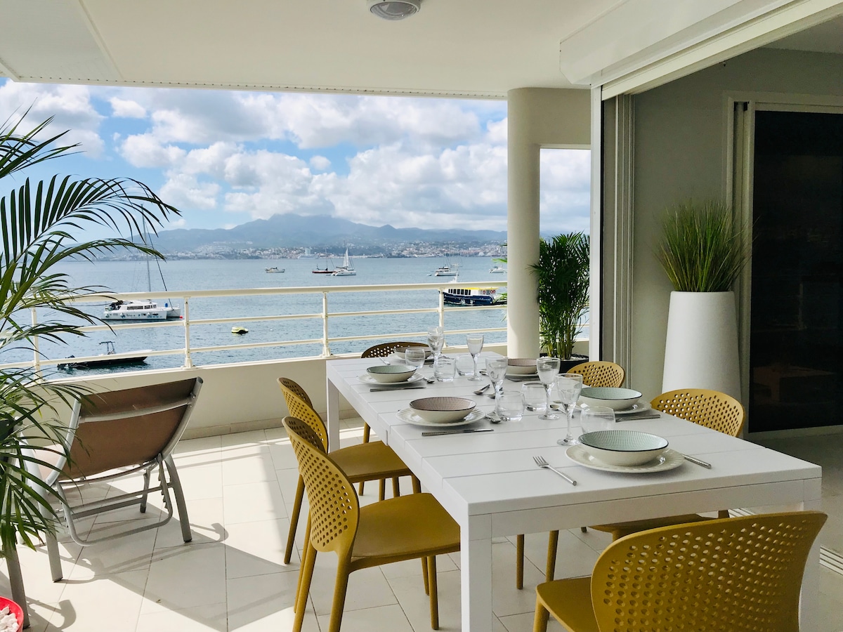 في تروا إيليت، أنسي ميتان، استمتع بعطلتك مع قدميك في الماء (25 مترًا من الشاطئ) مع إطلالة رائعة على البحر. شقة كبيرة مشرقة: غرفتي نوم مكيفتين مع غرفة ملابس وشرفة ممتعة وغرفة معيشة مريحة ومطبخ مجهز للغاية. كل شيء مخطط له: اليوغا، العمل عن بعد، سرير أطفال عند الطلب، التخزين. مسافة سيرًا على الأقدام: الحانات والمطاعم والكازينو وخدمة نقل القوارب إلى فورت دو فرانس. المكان المثالي للاستمتاع بمارتينيك!