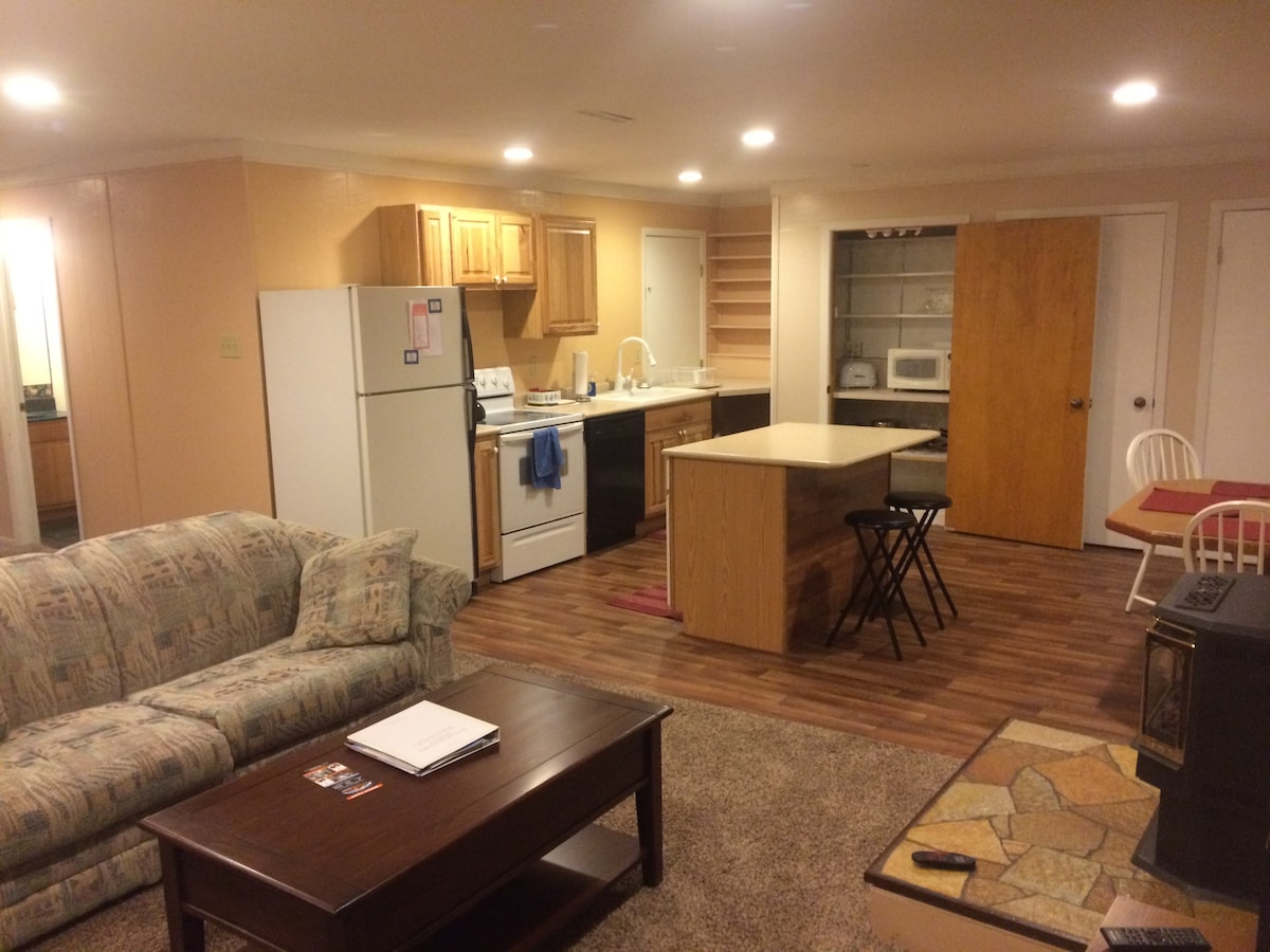 شقة فسيحة بغرفتي نوم، حمام واحد في الطابق السفلي مع مطبخ كامل (موقد، ثلاجة/مجمد، ميكروويف، محمصة، أواني، أدوات فضية، إلخ. تحتوي غرفة المعيشة على مدفأة غاز لطيفة قائمة بذاتها، مما يجعل الشقة مريحة للغاية. هناك أيضًا تلفزيون مع Amazon Firestick، مما يسمح للضيوف بالوصول إلى Netflix و Hulu و YouTube وما إلى ذلك. تحتوي كل غرفة نوم على سرير مريح بحجم كوين وخزانة ملابس ومدفأة كهربائية لمزيد من الراحة والأجواء.