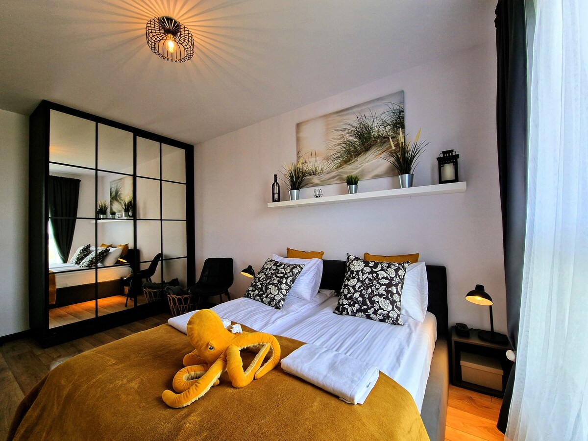 Luksusowy apartament z widokiem na Zatokę Gdańską, położony dzielnicy Letnica – zaledwie 10 minut od plaży. Przestrzeń dla 4 osób, stylowo urządzona, w pełni wyposażona, z balkonem i dostępem do zielonych tarasów rekreacyjnych. Idealne miejsce na wypoczynek blisko morza i atrakcji Gdańska. W pobliżu sklepy, restauracje, stadion Polsat Plus Arena, Park Reagana i centrum konferencyjne AmberExpo. Doskonałe połączenia komunikacyjne zapewniają łatwy dojazd do centrum i okolicznych atrakcji.