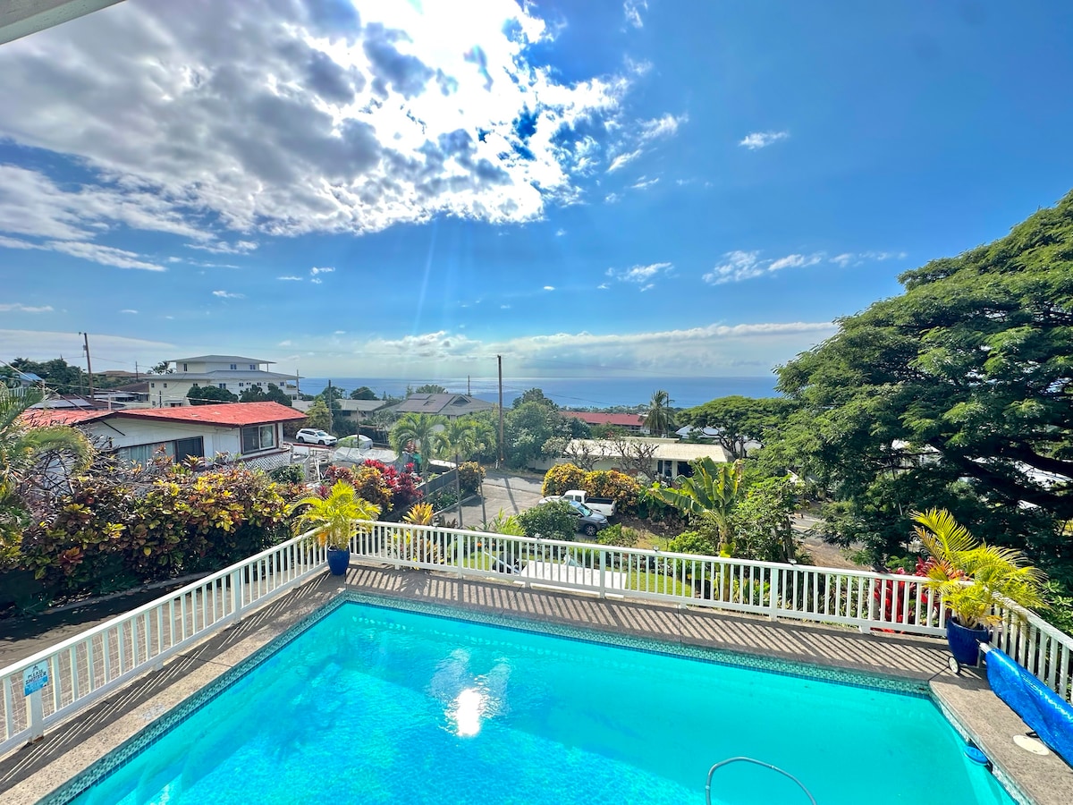 منزل مساحته 2300 قدم مربع على مساحة تزيد عن فدان مثالي لقضاء الوقت مع العائلة والأصدقاء. 10 دقائق من وسط مدينة كونا، في هولوالوا، مع القهوة العضوية وأشجار الفاكهة والزهور. هناك ألعاب على السطح مع غرفة تنس الطاولة تطل على الحديقة. كما يتم توفير ألواح التجديف ومعدات الغطس وكرة السلة والكثير من الألعاب. من السهل الترفيه على اللاناي الضخم مع الشواء ومطبخ مجهز بمواد الطهي الأساسية والمعدات. البيت مستضاف في العقار.