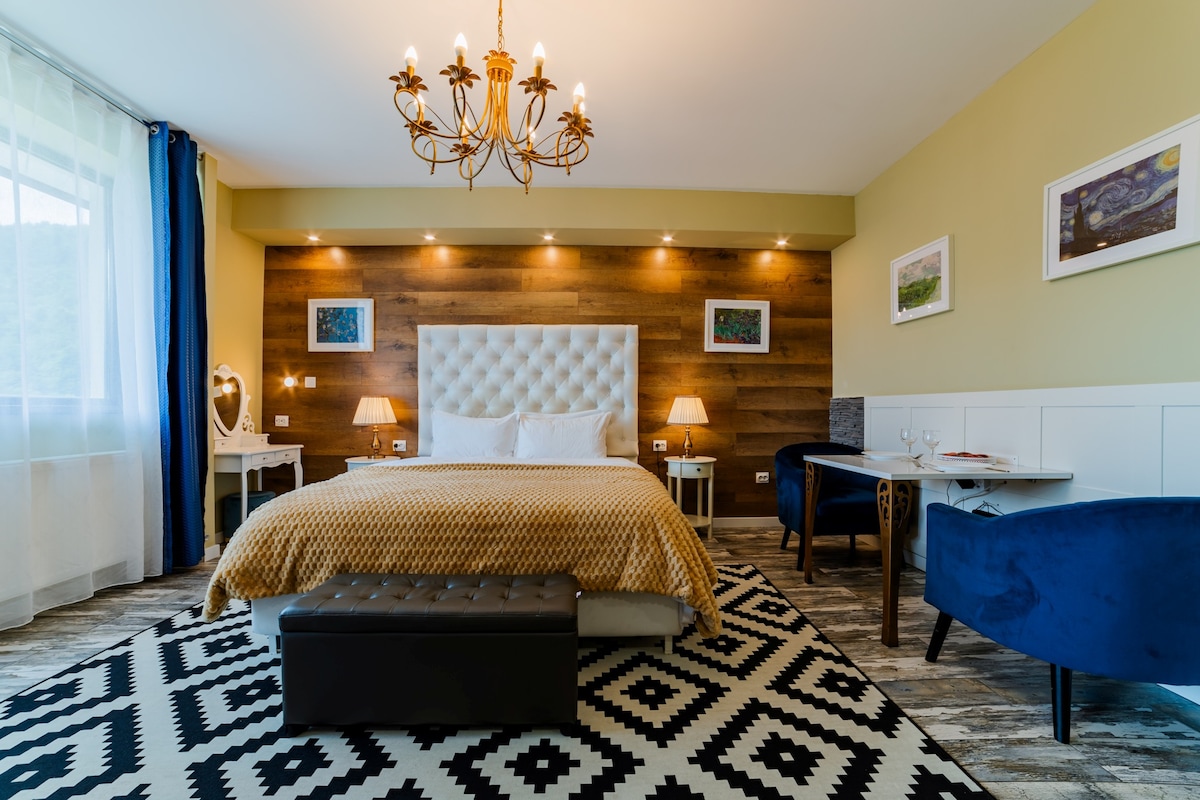 تقع شقة جاكوزي شيك الرومانسية في مجمع سكني جديد في مدينة سيناء الملكية ، وتوفر إطلالة رائعة على جبال بوشيغي. تحتوي الشقة ، التي تبلغ مساحتها 36 مترًا مربعًا ، على حوض استحمام ساخن مزدوج بجوار سرير كبير الحجم ، وهو مثالي للأزواج الرومانسيين الذين يبحثون عن تجارب سفر خاصة. يتوفر تلفزيون ذكي واسع النطاق مع برامج كابل ( بما في ذلك للبالغين ) واتصال لاسلكي بالإنترنت.