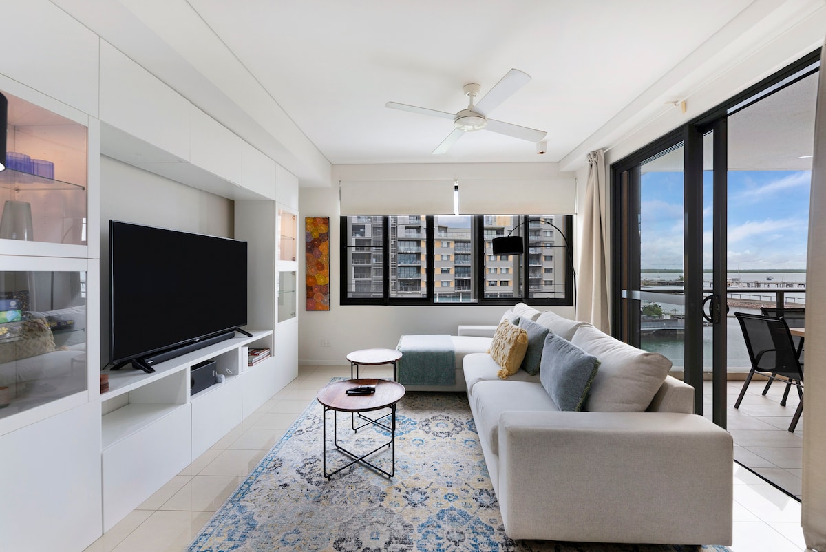 شقة فاخرة بغرفتي نوم في منطقة داروين ووترفرونت. شقة تجلب لك السلام والاسترخاء. مجهز بالكامل بصالة ومطعم مفتوح ومطبخ. ما يصل إلى 6 ضيوف: - غرفة نوم رئيسية (سرير كينج) - غرفة نوم ثانية (سرير كينج أو سريرين مفردين) - يتوفر سرير واحد قابل للطي ومرتبة أرضية وسرير أطفال. موقف سيارات، تلفزيون 75 بوصة، واي فاي، نسبريسو، غسالات ومجفف، إلخ. من المعروف أن الواجهة البحرية هي أفضل مكان في داروين (مركز المؤتمرات ، حمام سباحة الأمواج ، البحيرة ، المطاعم)