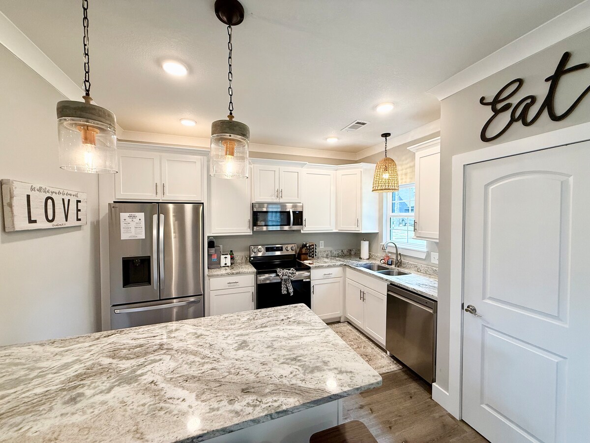 هذا مكان مثالي لجلب عائلتك أو مجموعة من الأصدقاء (حتى 8 أشخاص) - السباحة في حمام السباحة أو البحيرة، ويمكنك استئجار القارب في الموقع إذا رغبت في ذلك. يمكن لهذا البيت المكون من 4 غرف نوم/3.5 حمام أن يستوعب بسهولة عائلتين وأطفالهما. يقع الجناح الرئيسي في الطابق الرئيسي ويوفر راحة سرير كينج. المطبخ مجهز تجهيزًا جيدًا إذا اخترت الإقامة أو هناك العديد من المطاعم على بعد 10-15 دقيقة بالسيارة.