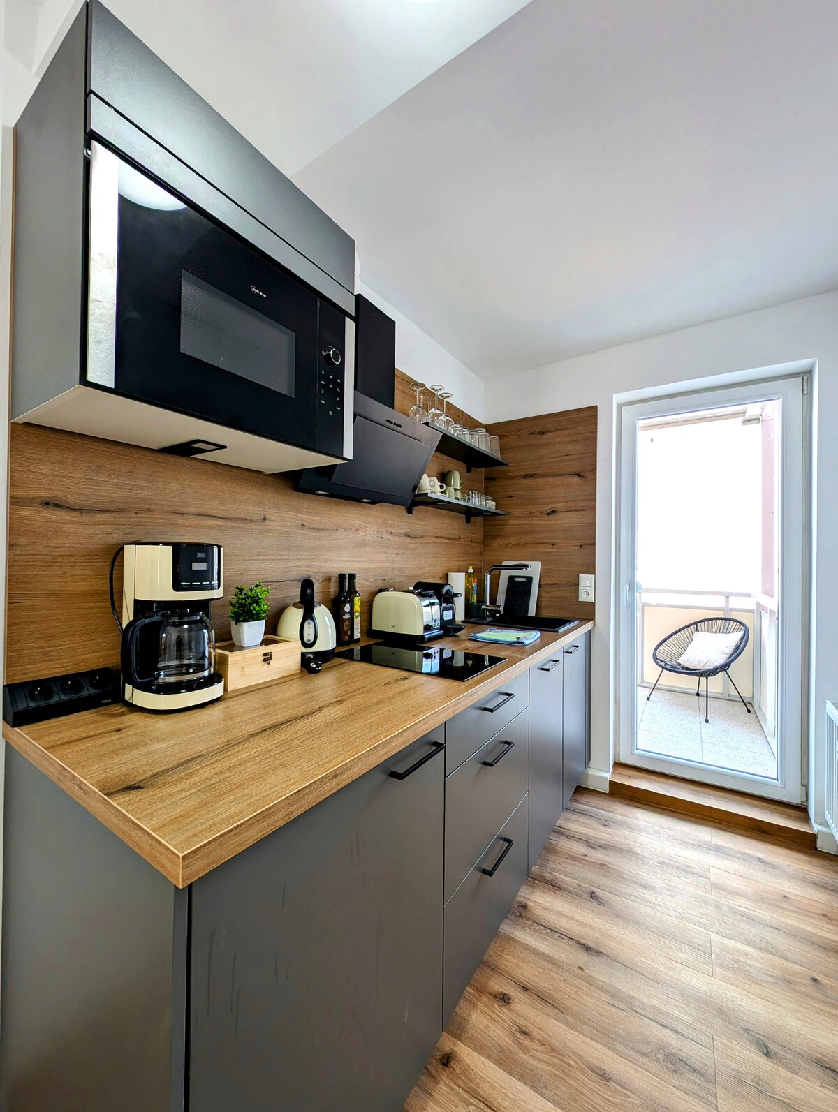Within a 6000 sqm plot below the Veste Coburg you get a bungalow with every comfort. 3 rooms, 100 sqm, with kitchen (equipped with everything), two bathrooms, secluded terrace with large garden. Absolutely quiet and yet right in the middle of it all. 5 minutes by car and 10 minutes on foot to the center. High-quality furnishings. Floor-to-ceiling windows with a wonderful view of nature and Coburg.