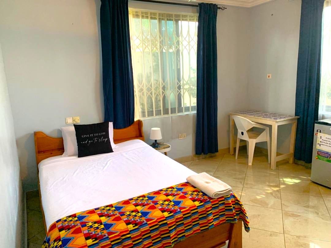 مرحبا بكم في مكان إيميلي! هذا هو هروبنا من صخب وصخب أكرا. يحتوي على سطح علوي وحديقة جميلة. يحتوي المنزل على غرفتي نوم (واحدة مزدوجة ، واحدة توأم) داخل الفندق مع مياه ساخنة ، وغرفة طعام واسعة مفتوحة/غرفة معيشة/ مطبخ. تعيش مدبرة منزلنا - بيتر - في الموقع وتعد طعامًا ممتازًا. نقدم إفطارًا مجانيًا ووجبات أخرى مصنوعة حسب الطلب (انظر القائمة أسفل الصور). يبعد الشاطئ (الذي يمكن الوصول إليه عبر فندق تيلز) خمس دقائق سيرًا على الأقدام.