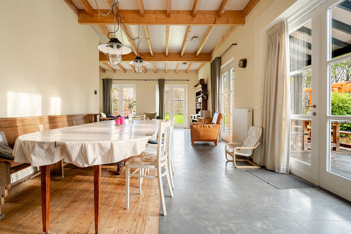 This cottage is located in nature reserve the Voornse Duinen at the end of a cycle path (accessible by cars) and 1.5 km from the sea. The house has a very large garden and unobstructed views to the meadow behind. The central living room features a wood stove and open kitchen. The two master bedrooms, each with their own bathrooms, are also on the ground floor. The first floor is for the children. There is a custom-made loft bed and an extra bed.