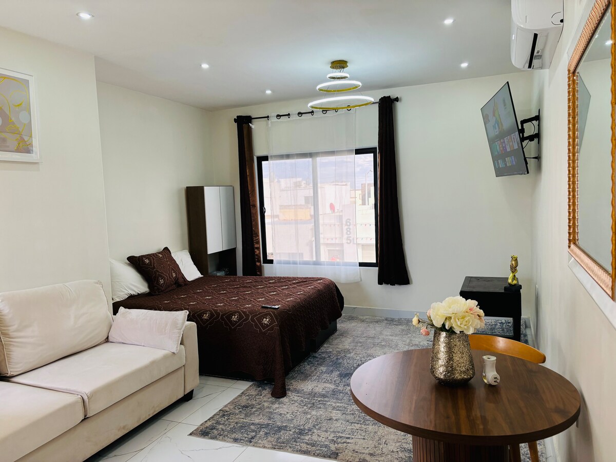 استوديو مزدوج كوين*مطبخ كامل*تلفزيون 75 بوصة*غسالة*دش مطري