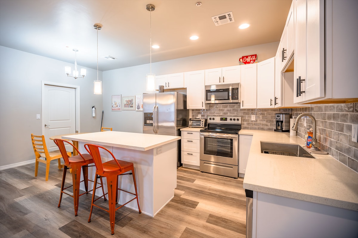 العلامة التجارية الجديدة وحدة دوبلكس أنيقة - هذا 1 غرفة نوم 1 حمام المنزل ينام 4 ويجلس في موقع مثالي على بعد دقائق فقط من المركز الطبي الإقليمي، I40، طريق 66 ووسط مدينة كينجمان التاريخية. كما أن البيت قريب جدًا من العديد من المطاعم الشهيرة وملعب الجولف المحلي وحتى ستاربكس. ما يفصل هذا البيت عن الآخرين في المنطقة هو أن لديك فناء جدار كبير وغسالة ومجفف وجميع أواني الطعام والشراب بالإضافة إلى ثلاجة كاملة الحجم وشواء بالغاز في الهواء الطلق وتلفزيون ذكي وما إلى ذلك.