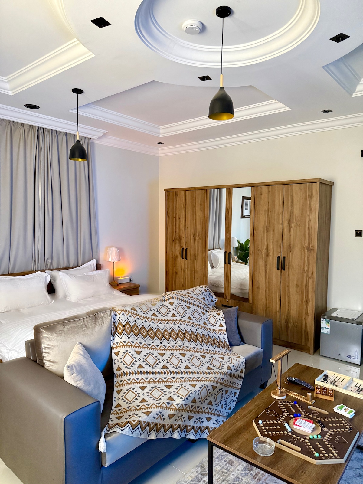 صمم الاستديو بطابع مريح للنزلاء وتوفير الخصوصية اللازمة للنزيل ويتكون الاستديو من سرير كبير ( كنج) وجلسة مريحة امام التلفاز ودورة مياه تمت الاستفادة من المساحات بتصميم الاستديو بشكل عصري هادئ ويمتاز بالاثاث العصري الفاخر كما ان موقع الاستديو قريب من جميع الخدمات اللازمة واهمية موقعة الاستراتيجي لقربه من المطار حيث انه يبعد 5 دقائق فقط. يتوفر بالاستديو انترنت وحساب شاهد مجاني وتلفاز المنزلية مثل ( ثلاجة) - مايكرويف - غلاية - العمارة هادئة ومزودة بمصعد وموقف واحد خاص للنزيل وتتميز بدخول ذاتي