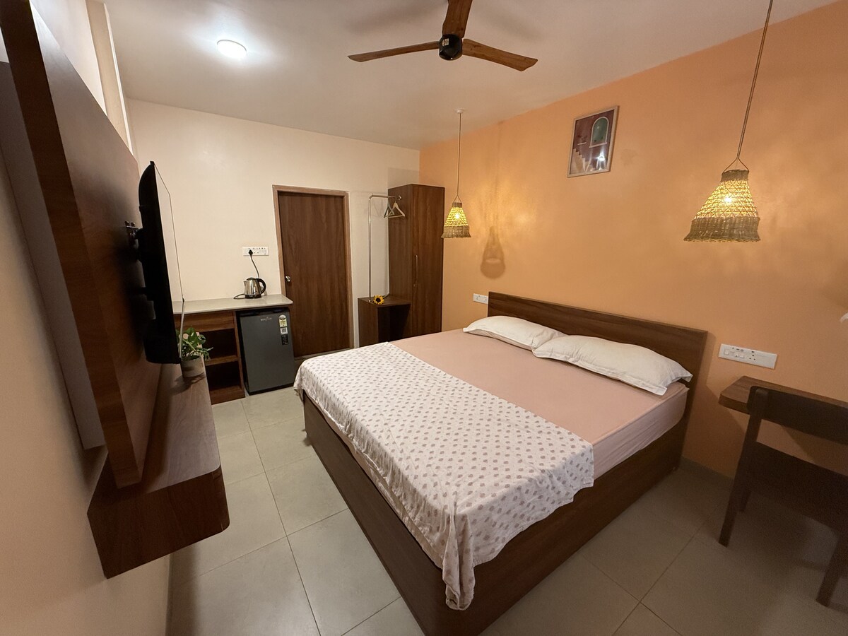 تقع غرفة الاستوديو هذه في شمال غوا. تحتوي الغرفة على سرير مريح بحجم كوين. لدينا حمام خاص نظيف مع مياه جارية ساخنة أو باردة. يوجد مطبخ مزود بأواني يمكنك استخدامها لطهي الوجبات. نحن نقدم خدمة الواي فاي المجانية لجميع ضيوفنا الذين يرغبون في العمل هنا أثناء العطلة. لدينا أيضًا تلفزيون ذكي للترفيه. يمكنك النقر على الاتصال بالمضيف لسؤالي عن أي شيء قبل الحجز.