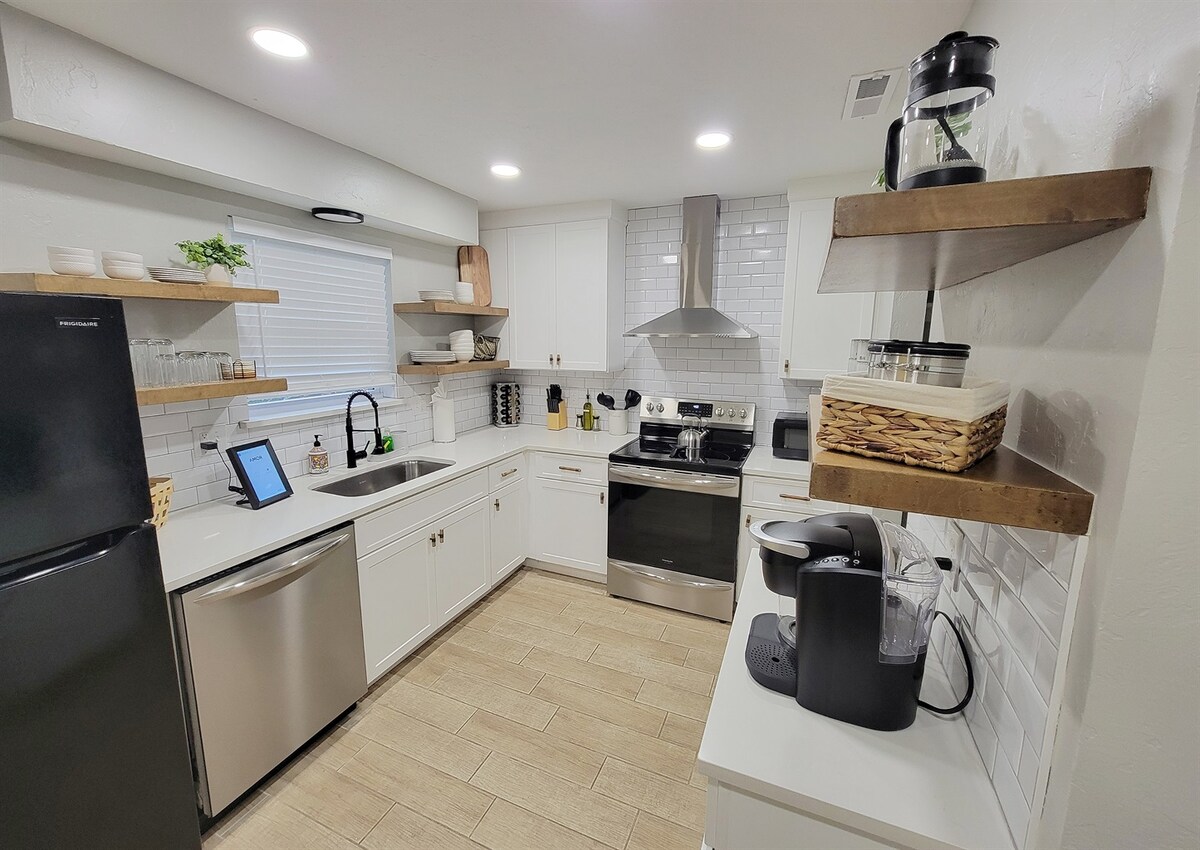 خصوصية هادئة! تم تجديدها بالكامل 3 غرف نوم جميلة، حمامان، مرآب سيارتين، مأوى من العواصف، فناء خلفي مسيج للخصوصية مع إمكانية الوصول إلى الفناء من الأبواب الفرنسية من غرفة المعيشة. مطبخ كامل، جميع الأجهزة وأدوات الطهي. غرفة نوم رئيسية مع خزانة ملابس كبيرة ومروحة سقف. إنترنت عالي السرعة وواي فاي، 3 تلفزيونات ذكية مع هوائي عالي الدقة. تلفزيون 65 بوصة في غرفة المعيشة؛ 50 بوصة في غرفة النوم الرئيسية. مكتب علوي قابل للطي، أريكة جلدية، مقاعد مزدوجة للاستلقاء. استمتع بالمياه النظيفة النقية من نظام التناضح العكسي في حوض المطبخ وصانع الثلج.