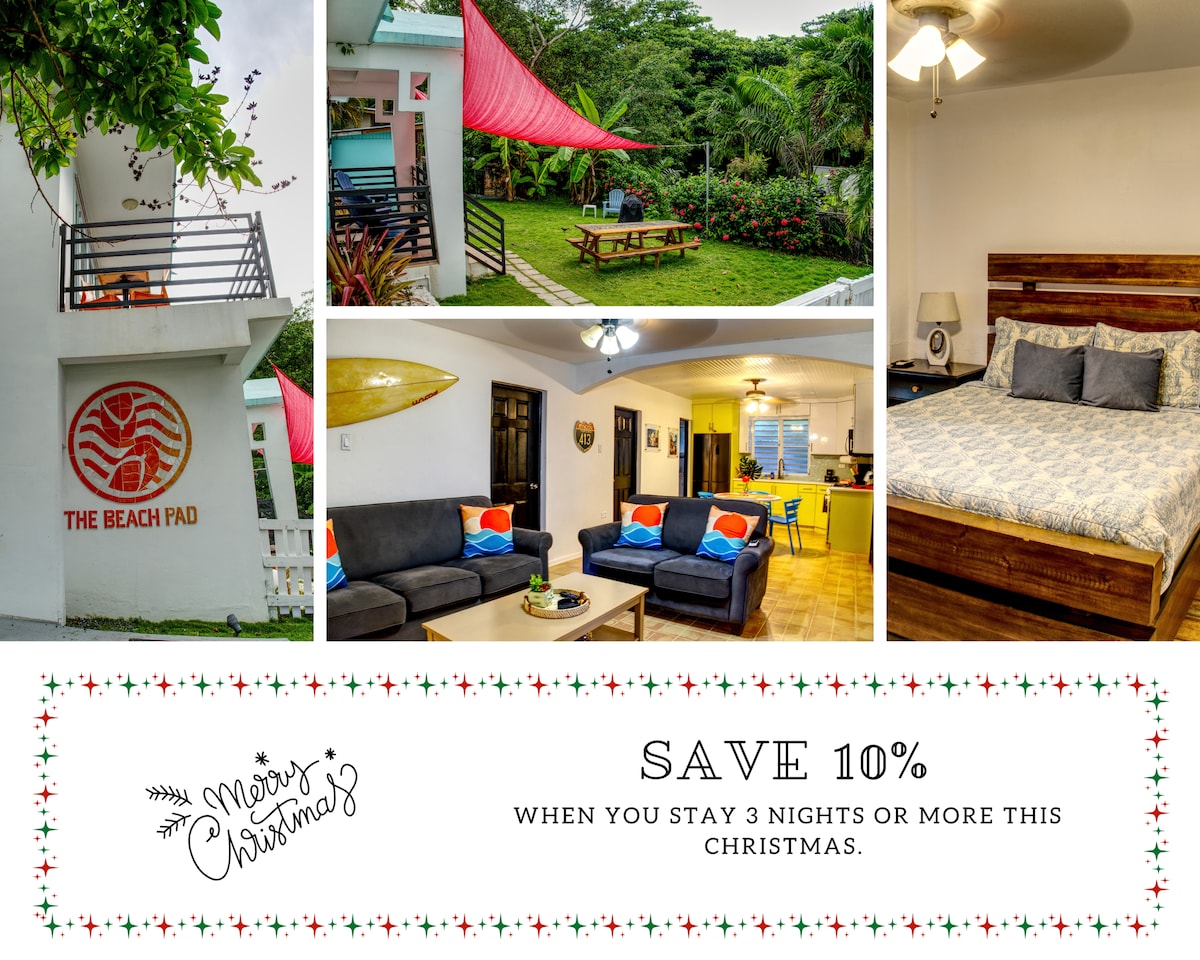 تجديدات جديدة! كازا تامبوريل هو البيت المثالي للإقامة في بونتاس. على بعد 0.2 ميل فقط من الشاطئ. بالقرب من المطاعم والحياة الليلية. يمكنك الاستمتاع بالإقامة في الطهي في مطبخ الطاهي أو المشي إلى مطعمك المفضل. التسكع تحت أشعة الشمس في حمام السباحة الخاص بنا. بيتنا مقاوم للكوارث مع مولد ديزل وألواح شمسية وخزانات مياه. إذا كان لديك مجموعة أكبر، يمكنك أيضًا استئجار كازا ترينيتاريا في الفناء الخلفي!
