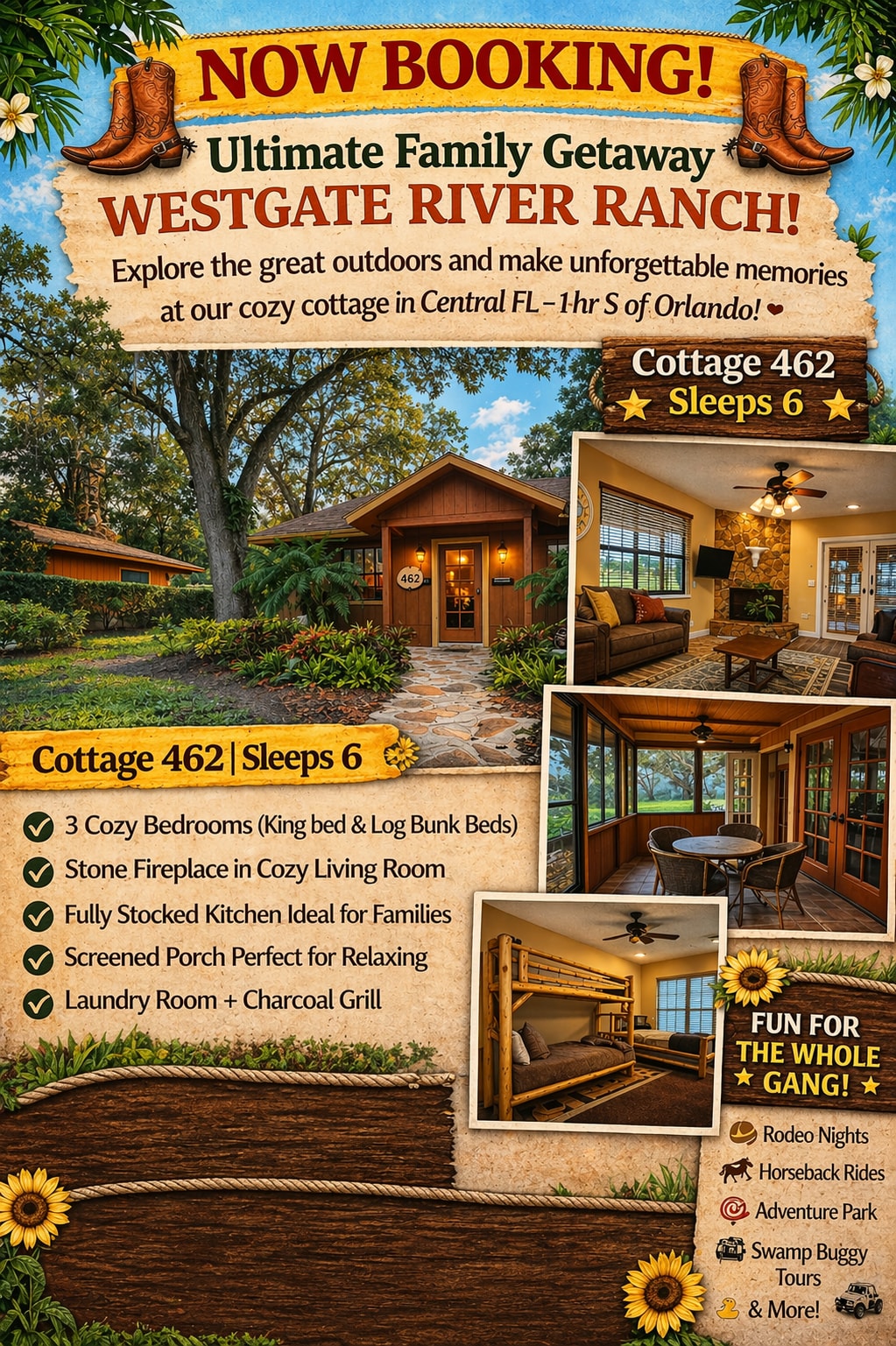 يقع هذا الكوخ المفروش بالكامل في وسط فلوريدا في منتجع غربي على بعد ساعة واحدة فقط من ديزني. غرفتي نوم/حمامين ومطبخ مجهز بالكامل بالأجهزة. شرفة خلفية خاصة مع ألعاب ومنطقة بار خارجية. الكثير من وسائل الراحة، هناك مسابقة رعاة البقر كل ليلة سبت مع صالون. تقدم المزرعة أيضًا الرماية، وركوب الخيل، وركوب عربات المستنقعات، وغولف البوت بوت، والثيران الميكانيكية، وتسلق الصخور. لمعرفة تكلفة الروديو والأنشطة الأخرى، يرجى الرجوع إلى ويست جيت