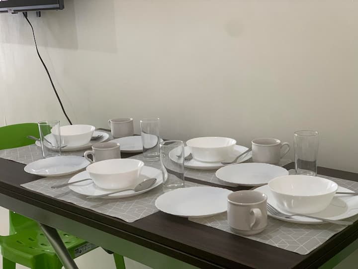 المطبخ الصغير مجهز بوسائل الراحة الأساسية، بما في ذلك ثلاجة وميكروويف وغلاية ماء ساخن وطباخ أرز، مما يسهل إعداد وجبات سريعة ووجبات خفيفة. لقد قمنا أيضًا بتزويد الوحدة بالأطباق والأواني، مما يضمن حصولك على كل ما تحتاجه للطهي الخفيف.