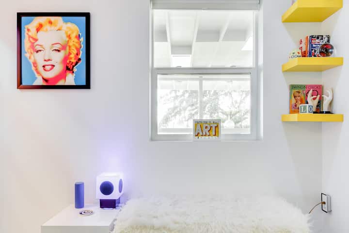 أنا من سكان كاليفورنيا الأصليين في جميع أنحاء الولايات المتحدة. لقد عشت في بيتي المملوءة باللون الفني منذ عام 1984. بدأ تجديد فن البوب قبل 10 سنوات واستغرق 4 سنوات لإكماله بسبب تردد الميزان الكلاسيكي.