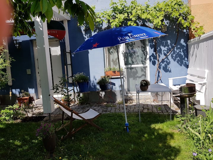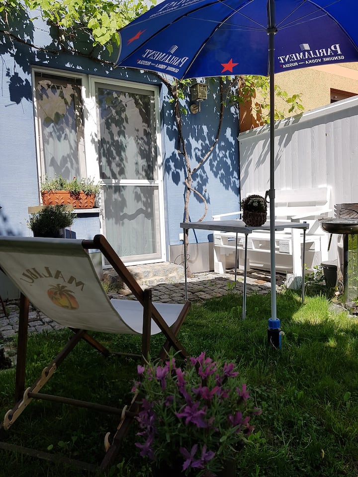شقة في المنزل الأزرق؛ حديقة مع شواية
