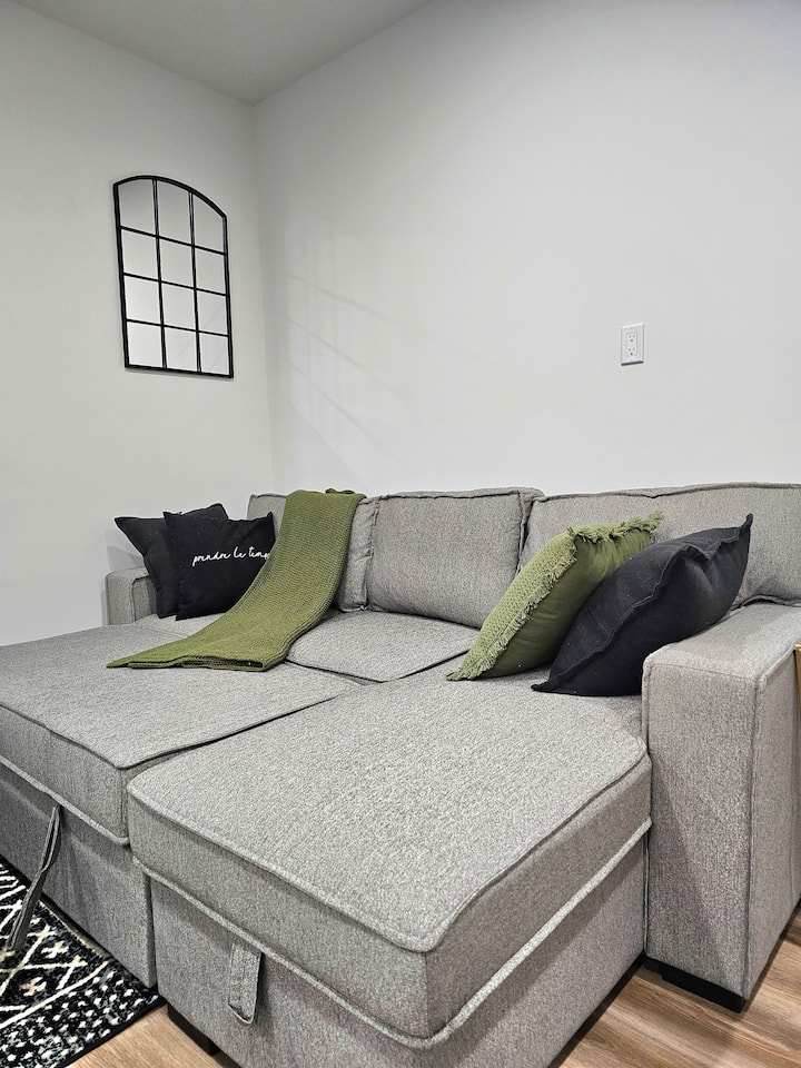 جناح مريح في الطابق السفلي يضم سريرين وحمامًا واحدًا يتسع لأربعة ضيوف
