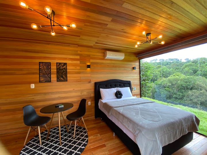 تخيل نفسك في كوخ ساحر، تحيط بك الطبيعة الخصبة. استرخِ في سرير مزود بجهاز تدليك، بعد يوم من استكشاف عجائب الحديقة!يمكن للضيوف الدخول مجانًا إلى: حمامات السباحة المنعشة والنهر والمسارات المنعشة والشلال الساحر ومناطق النزهة والملاعب.