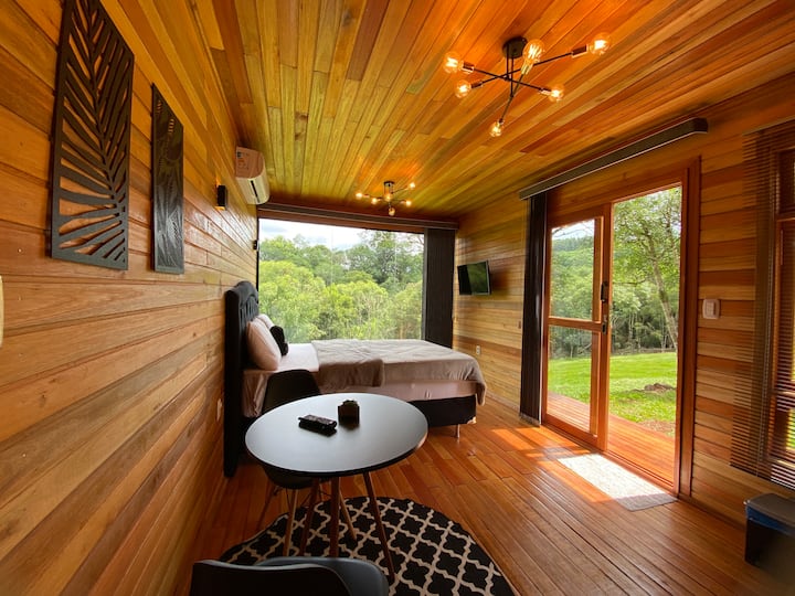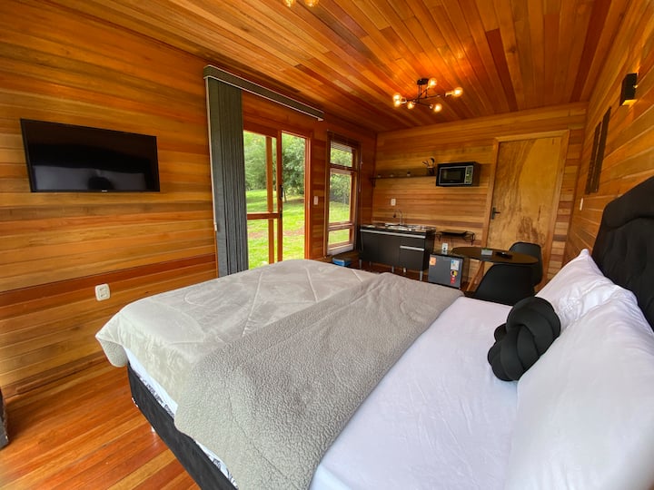 اكتشاف صيف أكونشيجو دا كابانا الداخلي: عند عبورك الباب الخشبي الجذاب، ستجد نفسك محاطًا بأجواء من الدفء والبساطة الأنيقة. يُشع الجزء الداخلي من المقصورة، مع هيمنته على الخشب، الدفء ويدعو إلى الاسترخاء الفوري. يتدفق الضوء الطبيعي عبر الجدار الزجاجي الواسع، مما يضيء كل التفاصيل المدروسة بعناية. يخلق الشعور بالاتساع والتكامل مع الطبيعة بيئة مثالية لإعادة شحن طاقتك. تأخذ منطقة الاستراحة مفهوم الاسترخاء إلى مستوى جديد. يقدم السرير المريح، المزود بفراش ناعم وألوان محايدة، الآن لمسة خاصة: جهاز تدليك مدمج. تخيل نفسك مستلقيًا بعد يوم من المرح في الحديقة، وتفعيل هذه الوظيفة والشعور بالعافية من خلال جسمك. توفر تركيبات الإضاءة الصفراء لمسة دافئة وعملية. الحمام، على الرغم من صغر حجمه، لا يتخلى عن الراحة والوظائف. تخلق الطلاءات الخفيفة إحساسًا بالنظافة والرفاهية. مساحة كبيرة ومقعد عملي ودش منعش يضمن لحظات من العناية الشخصية. الجو العام هو الملجأ والهدوء. تم اختيار كل عنصر لإنشاء مساحة تلتقي فيها الطبيعة بالراحة الحديثة. تسمح النوافذ، عند فتحها، للضوء والمناظر الطبيعية بأن تصبح جزءًا من الديكور، بينما تضمن النوافذ المغلقة الخصوصية وأجواء ترحيبية ليلاً. إن مسكنك في Lisot Park هو أكثر من مجرد مكان للنوم؛ إنه ملاذ خاص حيث تم التفكير في كل التفاصيل لتوفير تجربة استضافة لا تنسى، مما يوصلك بجمال الطبيعة دون التخلي عن الراحة والرفاهية. استعد للشعور وكأنك في بيتك في وسط جنة طبيعية.