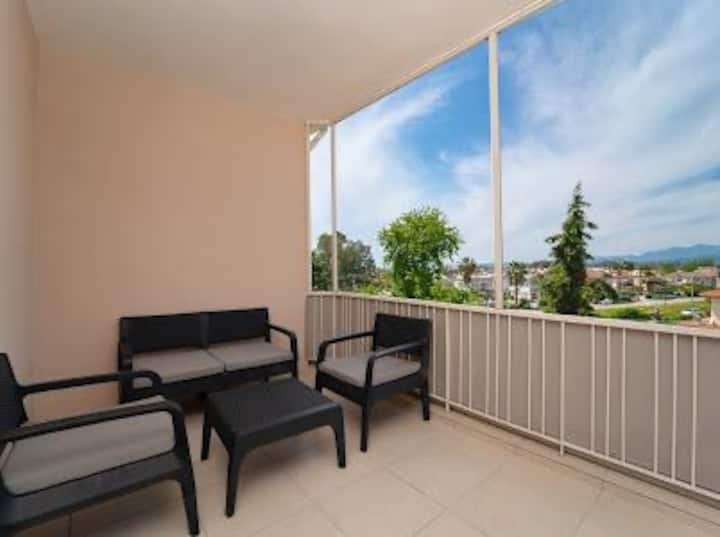 هناك غرفتان وغرفة معيشة ومطبخ واحد. على بعد 10 دقائق تقريبًا من المركز، وإنترنت سريع،وموقف سيارات،وحمام سباحة