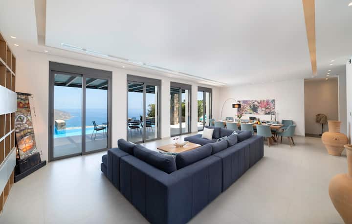عند دخول الفيلا من الباب الأمامي الرئيسي، تؤدي الدرجات الحجرية إلى أسفل من مدخل المعرض إلى منطقة معيشة / طعام كبيرة مفتوحة. توفر الأسقف العالية والأبواب المنزلقة الزجاجية الكبيرة والإطلالات الخلابة على بحر إيجة وسبينالونغا إحساسًا بالهدوء والتهوية.