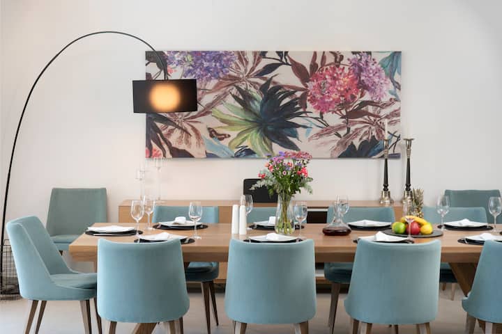 يؤدي المطبخ الواسع إلى منطقة الصالة/ الطعام وهو مجهز بالكامل بأجهزة حديثة - فرن بمساعدة مروحة، موقد سيراميك، ميكروويف، ثلاجة/ مجمد مزدوج الباب مع صانع ثلج، غسالة أطباق، ماكينة قهوة فلتر، ماكينة نسبريسو، غلاية ومحمصة خبز. تؤدي الأبواب الزجاجية المنزلقة الكبيرة من المطبخ إلى الفناء الداخلي مع مقاعد إيطالية مصممة وشواء ويبر لأولئك الذين يستمتعون بالشواء.