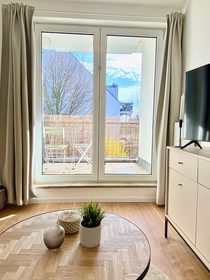 شقة حديثة بغرفة نوم واحدة مع شرفة وموقف سيارات وتلفزيون