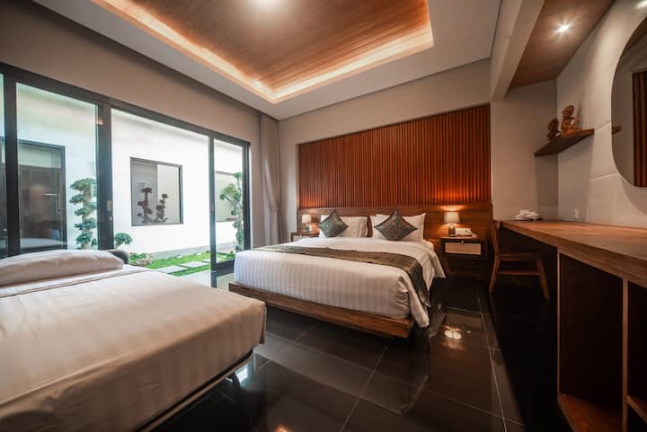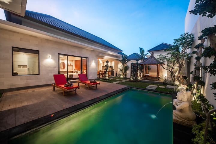تتميز بأجنحة لاجون مباشرة مصممة بثقافة مقترنة بالراحة الحديثة ووسائل الراحة المذهلة. Gaing Mas Jimbaran Villas هي واحة فريدة حقًا من نوعها في قلب جيمباران. كاملة مع حانة صغيرة لتناول الطعام، وبار حمام سباحة، وصالة ألعاب رياضية، وصالة، ومنتجع صحي، ومركز أعمال، وغرفة معيشة داخلية/خارجية ومنطقة لتناول الطعام، وحمام سباحة كبير الحجم. هذه الفيلات الرائعة مثالية لأي شيء من يوم حمام سباحة عائلي، ويتراجع الزوجان إلى بوابة شهر العسل. استمتع بحديقة خصبة وهدوء هادئ في هذا الموقع الرائع.