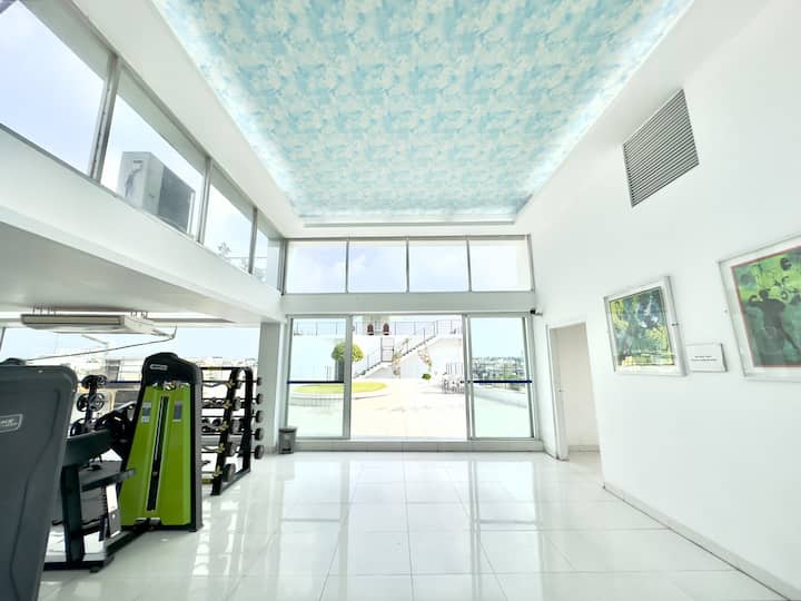 شقة فسيحة تتسع لأربعة أشخاص بغرفة نوم واحدة وصالة ألعاب رياضية وحمام سباحة