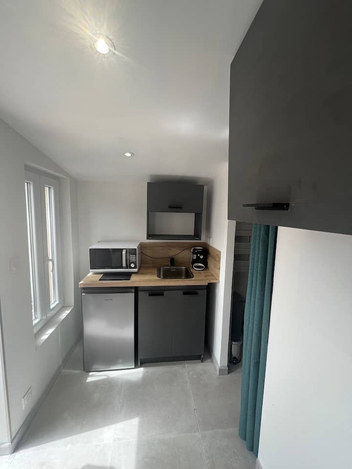 - مطبخ صغير ومنطقة لتناول الطعام وطاولة وكراسي (ثلاجة، مواقد، غلاية، ماكينة قهوة دولتشي غوستو، غسالة أطباق، أواني فخارية ومستلزمات مطبخ، وما إلى ذلك)