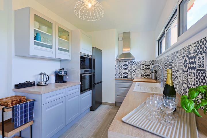 مطبخ ودود وحديث وعملي مع ثلاجة مشتركة كبيرة وموقد خزفي رباعي الشعلات وشفاط وفرن وميكروويف. كل ما تحتاجه للطهي متاح لاستخدامك.