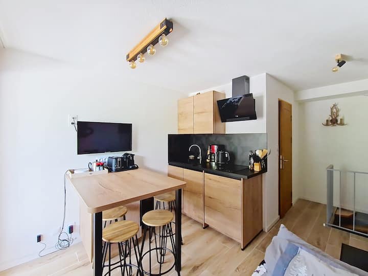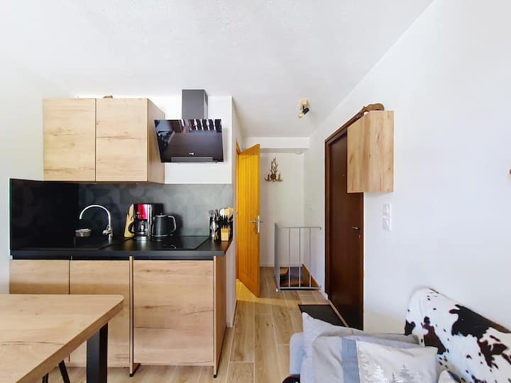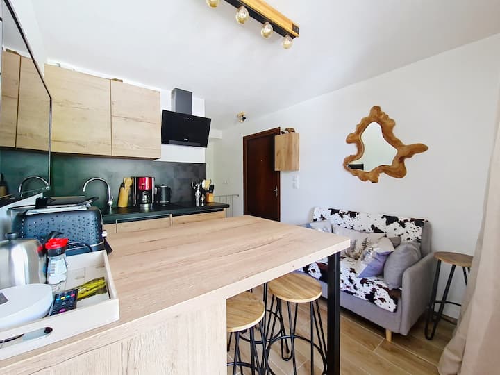 شقة مريحة في الطابق الأرضي 2* 25 مترًا مربعًا. غرفة معيشة مشمسة في الصيف، تلفزيون بشاشة مسطحة. مطبخ مفتوح مجهز بموقد حثي، وثلاجة، وغسالة أطباق، وماكينة قهوة نسبريسو، وغلاية، وفرن، وميكروويف، ومحمصة خبز.