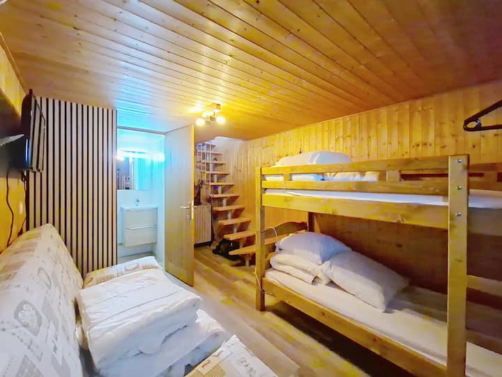 - غرفة في الطابق السفلي يمكن الوصول إليها عبر درج ضيق: سرير بطابقين واحد 90*190 سم وسرير أريكة واحد 140*190 سم