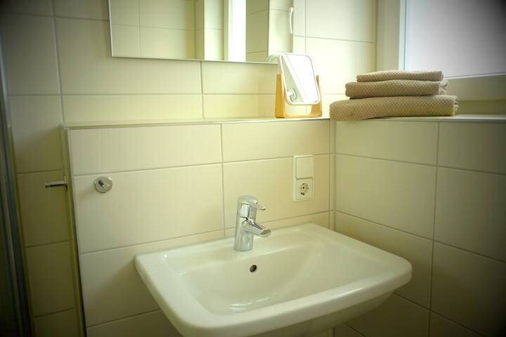 دش في الطابق الأرضي ومرحاض ومرآة واسعة ومغسلة ومرآة تزيين ومجفف شعر.