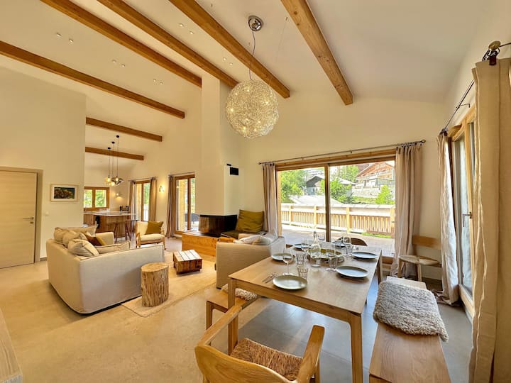الراحة والأناقة: تم تصميم هذا المسكن لاستيعاب ما يصل إلى 12 شخصًا بشكل مريح، وهو مثالي لـ 6 بالغين و 6 أطفال. توفر غرفة المعيشة التي تبلغ مساحتها 60 مترًا مربعًا بمطبخها المفتوح (المجهز بالكامل) والمدفأة مساحة ودية ودافئة، حيث يتم إنشاء الذكريات بسبب النار.