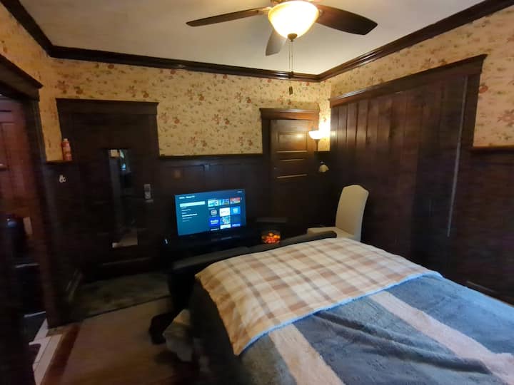 أثناء إقامتك، يمكنك أيضًا استخدام الغسالة والمجفف الموجودين في الطابق السفلي (في الطابق السفلي، فوق مستوى الشارع، بفضل وجود المنزل على تل). يأتي حجزك مع مساحة واحدة لوقوف السيارات في موقف السيارات الخاص بنا؛ تتوفر الكثير من أماكن وقوف السيارات الإضافية في الشارع القريب، حيث يقع بيتنا على زاوية، وقطريًا عبر تقاطع الشارع الأخير من موقف السيارات عند مدخل حديقة المدينة، والذي يمكنك استخدامه أيضًا. مدخل الحديقة ليس المدخل الرئيسي ولكن مدخل مركبة الخدمة المحظورة عادة (ولكنه مفتوح لدخول المشاة على جانبي البوابة المحظورة)، لذلك فهو هادئ للغاية ولا توجد حركة مرور كثيرة. بعد المشي عبر هذا المدخل، وحوالي 80 ياردة من الطريق المبطن بالأشجار مع تيار على جانب واحد، سترى أكثر من 400 فدان من الأراضي المشذبة بشكل جميل (مثل ملعب غولف ضخم، وهناك ملعب غولف فعلي كامل الحجم مكون من 18 حفرة في عمق الحديقة)، وأحواض الزهور، وبركة الأسماك وبحيرة البجع مع عائلات البجع الحقيقية التي تعيش على البحيرة! هناك أيضًا ملاعب تنس وملعب للأطفال في الحديقة الضخمة.