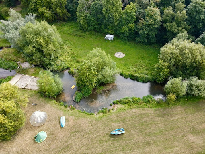 أنشطة التخييم في المزارع على ضفاف النهر بما في ذلك حفرة النار
