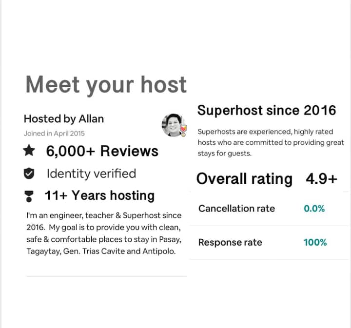 بصفتي مهندسًا ومعلمًا ومضيفًا متميزًا لأكثر من 10 سنوات، أقود فريقي لتقديم نهج يركز على التفاصيل والضيوف في كل إقامة. نحن ملتزمون بتزويدك ببيت نظيف وآمن ومريح بعيدًا عن البيت. اكتشف جميع مساكننا في باساي وتاغايتاي وجنرال ترياس وإيموس وأنتيبولو على www.airbnb.com/p/cleansafehomeph. نتطلع إلى استضافتك.