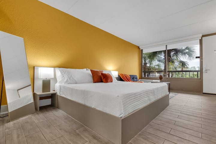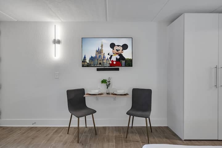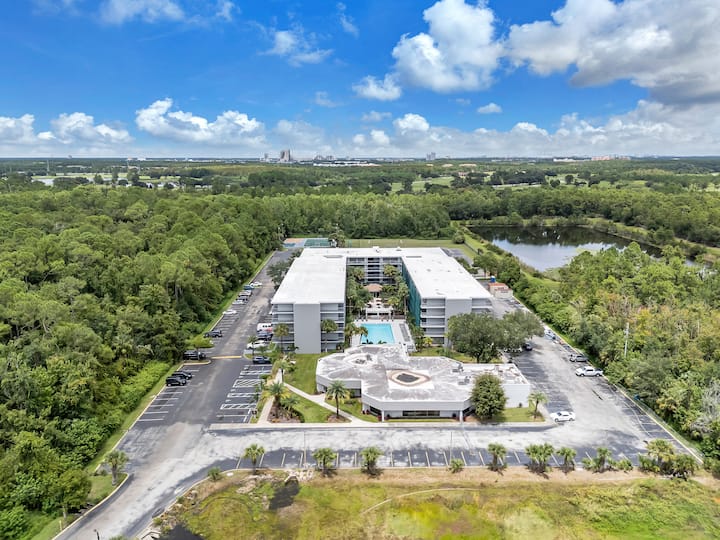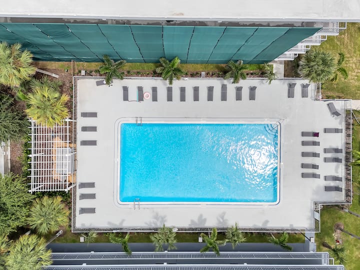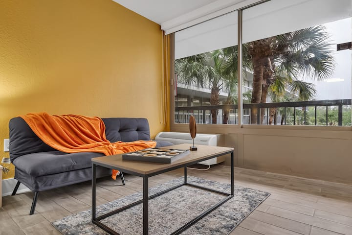 استوديو مشمس على بعد 8 دقائق من ديزني، مع حمام سباحة وموقف مجاني للسيارات