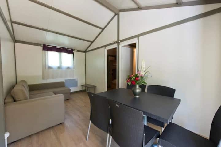 ستقيم في شاليه سيكويا مساحته 35 مترًا مربعًا مغطى بالخشب، ويضم