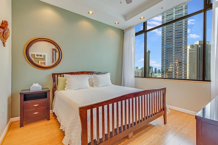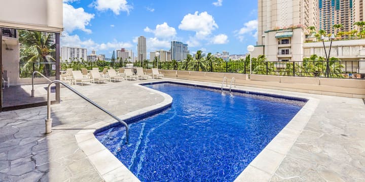 شقة مشرقة بالقرب من شاطئ وايكيكي مع حمام سباحة