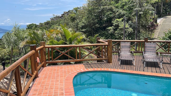 بيت مع حمام سباحة وشواء وإطلالة على البحر