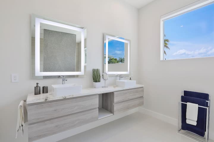 يتميز الحمام المرفق في ماستر سويت 1 بحوض استحمام مستقل ودش زجاجي بمساحة 4.5 متر مربع وإضاءة سقف LED غير مباشرة وأحواض مزدوجة أنيقة مع مرايا مضاءة. بالطبع مع مرحاض منفصل.