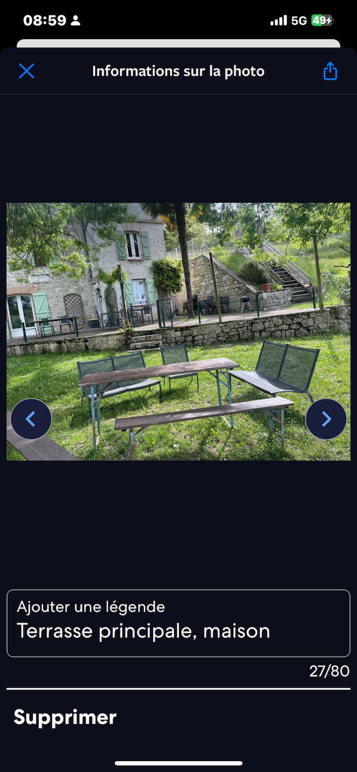 بعد ذلك، على بعد 10 أمتار خلف المنزل، يوجد استوديو، ويتكون هذا الاستوديو من ثلاثة أسرّة كبيرة، وسرير مزدوج مقاس 140/200، وسرير فردي مقاس 90/200، وسرير أريكة مزدوج. هذا يعني تسعة أسرّة أخرى. لديك تلفاز. في مكان الإقامة نفسه، يوجد حمام مجهز بدش ومرحاض ومغسلة. لديك أيضًا خزانة تحتوي على بعض الأواني الفخارية الصغيرة تحت تصرفك. كما يوجد لديك أيضًا كوخ صغير بجوار حمام السباحة يضم سريرين صغيرين فرديين مقاس 90/190 سم مع مرحاض إضافي. كما يوجد مرحاض خارجي آخر في الطابق الأرضي للمسبح. يحتوي المنزل على ما مجموعه 21 سريرًا. ثم في الخارج لديك حمام سباحة خاص كبير. أبعاد حمام السباحة 10.50 × 5.50. العمق 1.30 متر. حمام السباحة مؤمّن بالكامل بحواجز وبوابة بمفتاح للأطفال. بجوار حمام السباحة، توجد كراسي استلقاء للاسترخاء. مظلات. دش يعمل بالطاقة الشمسية.