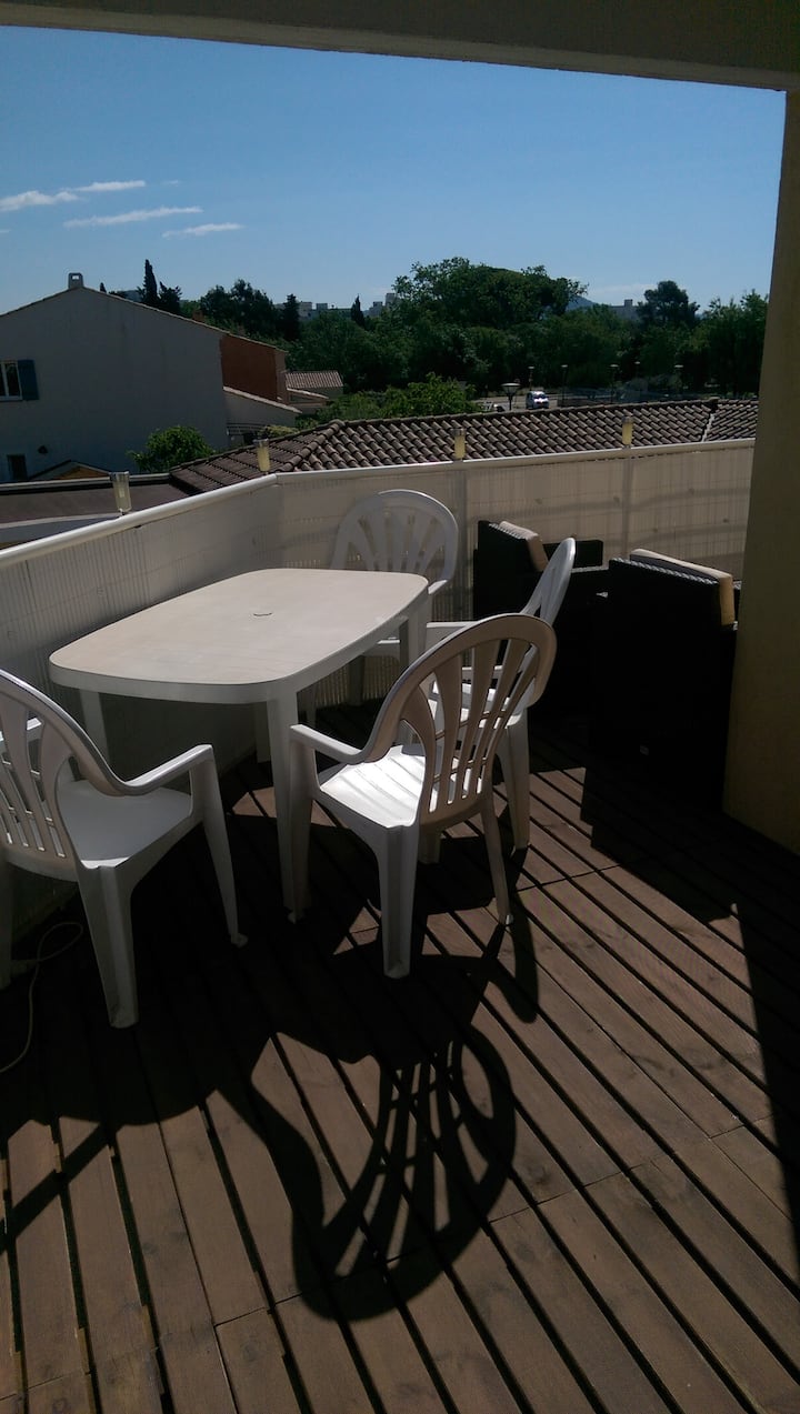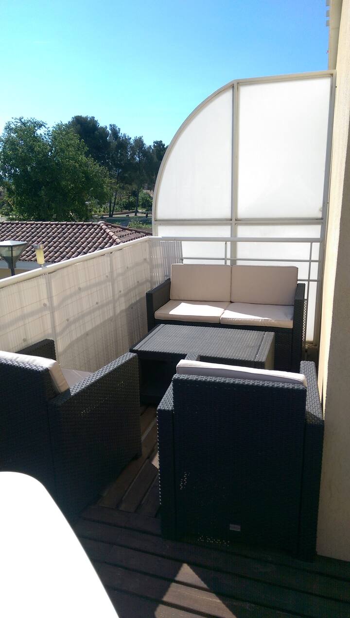 T2 مكيفة الهواء وآمنة وهادئة وتحتوي على تراس وقريبة من البحر