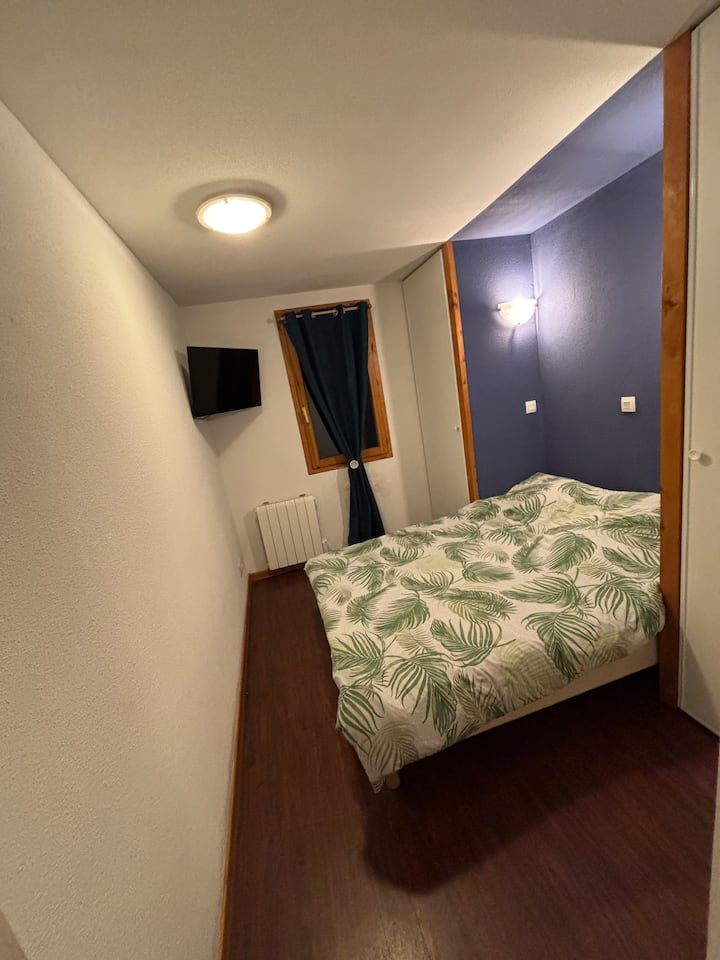 * سرير مزدوج بغرفة نوم واحدة 140 × 190، خزانة ملابس، نافذة مع ستارة، تلفزيون حائط، مدفأة