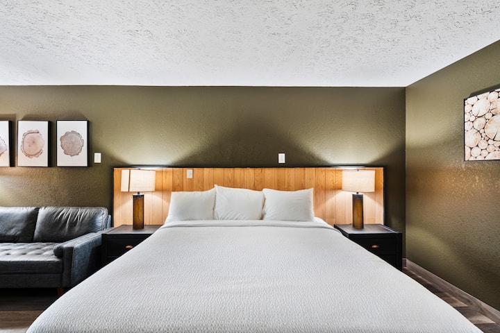 غرفة مجددة تحتوي على سرير كينج ومناسبة للحيوانات الأليفة
