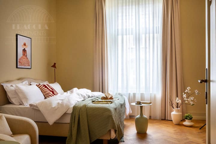 غرفتا نوم مريحتان بالقرب من الساحة الرئيسية مع مطبخ كامل