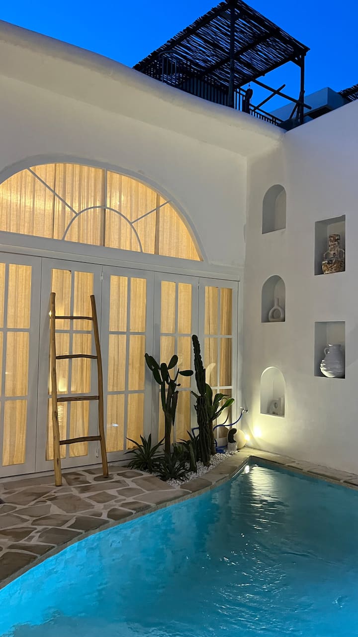 حوض استحمام وغرفة نوم بوهيمية متوسطية ومسبح خاص